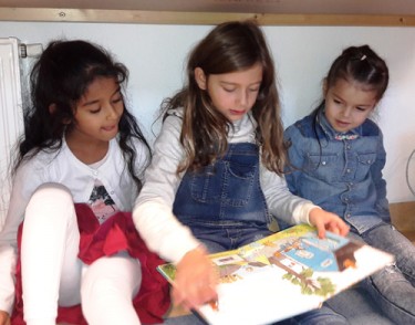 Kinder der höheren Klassen lasen an diesem Tag den Kindern unserer ersten Klassen Geschichten vor. Dafür nützten wir unsere Schulbibliothek und auch die Aula der Schule.